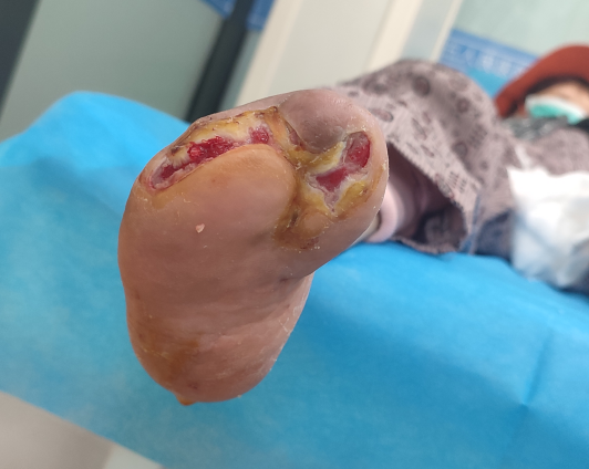 患者甘*英,女,86岁,广西贵港人,糖尿病病史20年,未规律检测血糖变化。4个月前,患者无明显诱因出现足部破溃,未引起足够重视,随后创面出现红肿热疼,自行用碘伏消毒,局部流脓,剧烈疼痛,并向其余足趾蔓延。