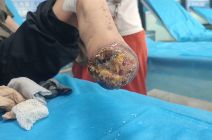 第一个是左脚截肢后伤口不愈合。据患者讲,做手术的医院是一家三甲综合医院,去医院就要做手术,完全不顾患者及家属的诉求,结果出现截肢后伤口不愈合的情况。
