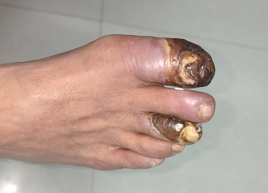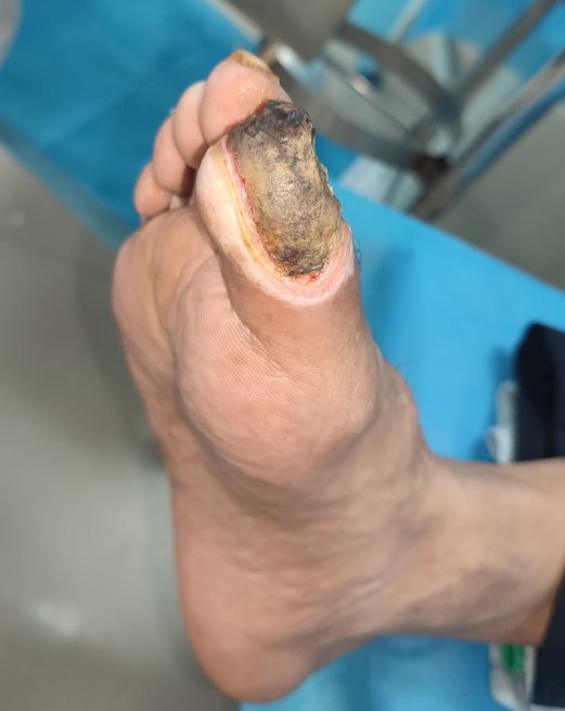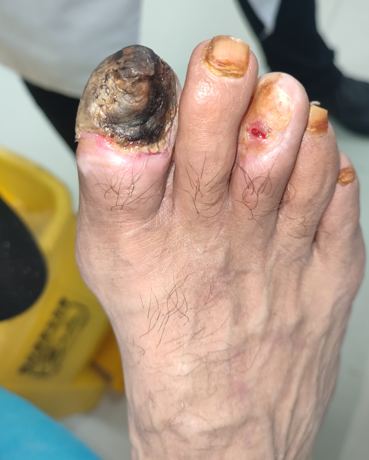 糖尿病足脚趾发黑,属于缺血性干性坏疽,伴有下肢动脉疾病,血供障碍是主要原因。入院之后,我们通过中西医结合的方法,制定方案改善他的下肢血供。