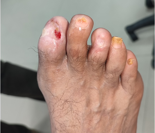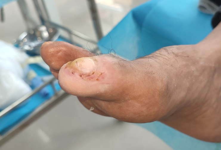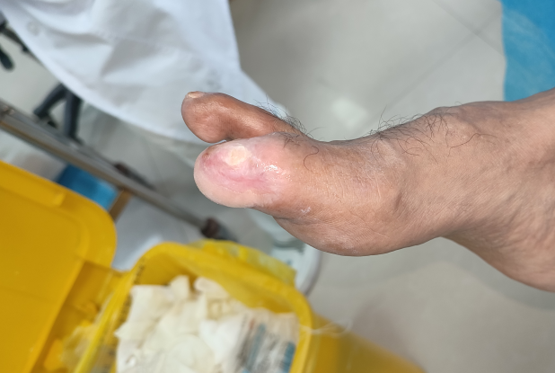 通过治疗,患者右足第2趾基本愈合,出院后自行换药,现右足第1、3趾溃疡面逐渐向近心端蔓延,其余足趾发红,当地多家医院建议截肢,患者为求保肢,转到我院糖尿病足科接受保守治疗!