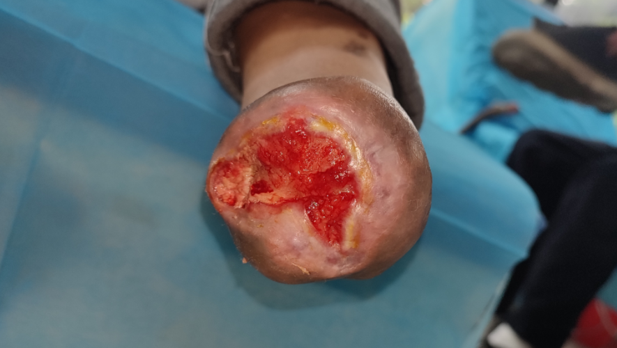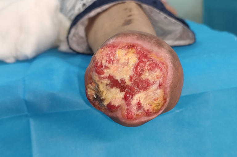 第一个是左脚截肢后伤口不愈合。据患者讲,做手术的医院是一家三甲综合医院,去医院就要做手术,完全不顾患者及家属的诉求,结果出现截肢后伤口不愈合的情况。