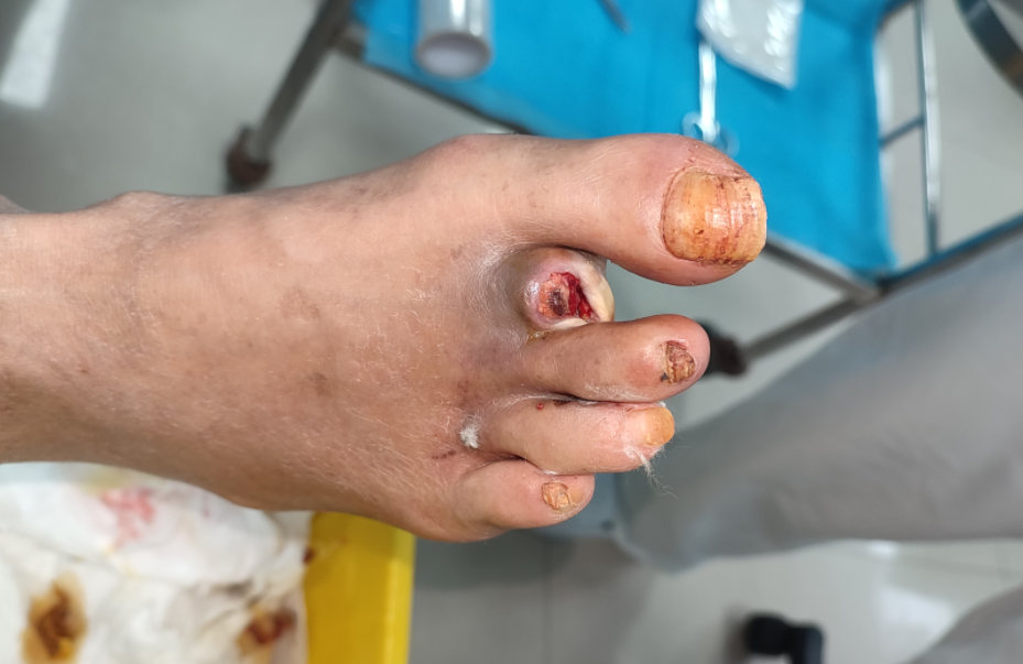袁*生,男,61岁,陕西人,糖尿病病史20年。一年前,患者因左足溃疡,于当地治疗期间行截肢术,术后伤口不愈合。2个月前,患者右足第2趾无明显诱因出现红肿,未给予重视,随后出现发黑坏死,于是去当地医院治疗,给予截趾术,术后伤口不愈合,为求进一步治疗转到我院。