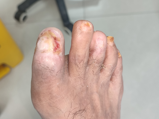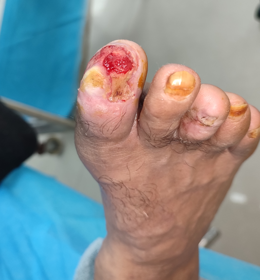 通过治疗,患者右足第2趾基本愈合,出院后自行换药,现右足第1、3趾溃疡面逐渐向近心端蔓延,其余足趾发红,当地多家医院建议截肢,患者为求保肢,转到我院糖尿病足科接受保守治疗!